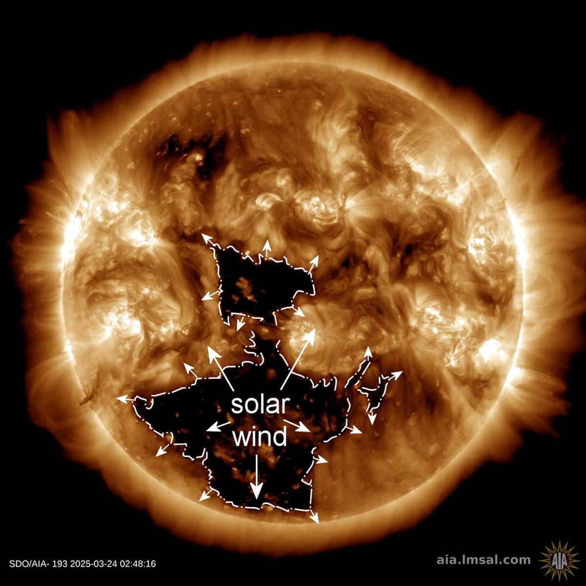 На обращенной к Земле части Солнца наблюдается очень крупная корональная дыра. Это область в верхних слоях атмосферы звезды, где ослабли магнитные поля; в результате Солнце бомбардирует окрестности потоком заряженных частиц.