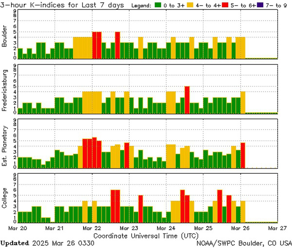 Согласно наблюдениям NOAA США, мартовская серия магнитных бурь в итоге растянется почти на неделю. Первая буря конца месяца была зафиксирована 22 марта, последняя ожидается 27 марта.