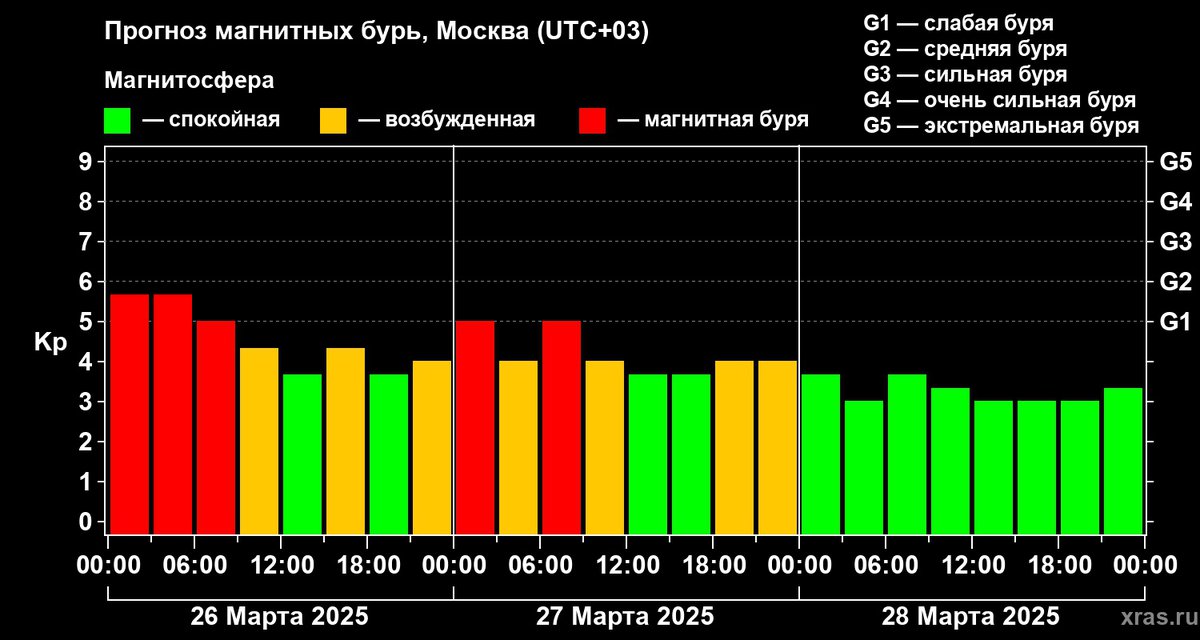 26 марта, считают аналитики, магнитосфера Земли будет возмущена на протяжении большей части дня. Самая сильная часть магнитной бури завершится в районе 9 утра по Москве, но на протяжении всего дня ожидаются «афтершоки».