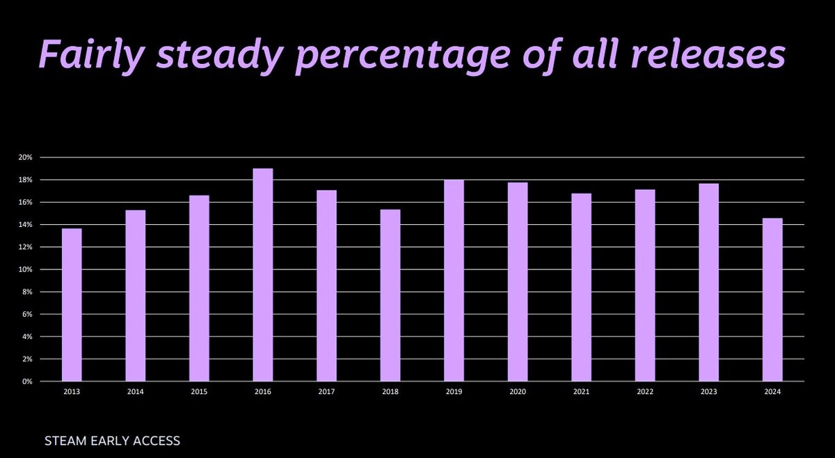 Примечательно, что в процентном соотношении наблюдается другая картина: количество игр в раннем доступе остается в пределах 13-19% от общего числа проектов, выходящих в Steam. Рост с предыдущего графика объясняется увеличением числа игр, выпускаемых в Steam.