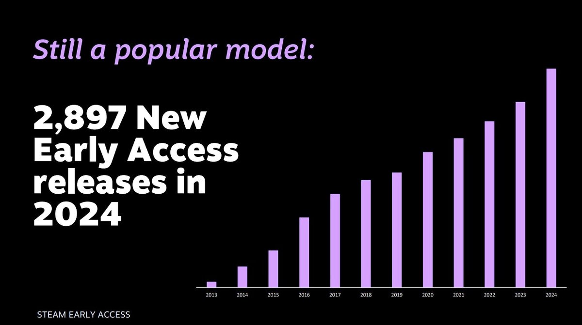 Также Valve сообщила, что в 2024 году в раннем доступе Steam вышло 2897 игр. Этот показатель постоянно растет — число игр, выходящих в раннем доступе, увеличивается на протяжении всего времени существования Steam.