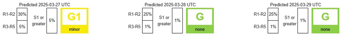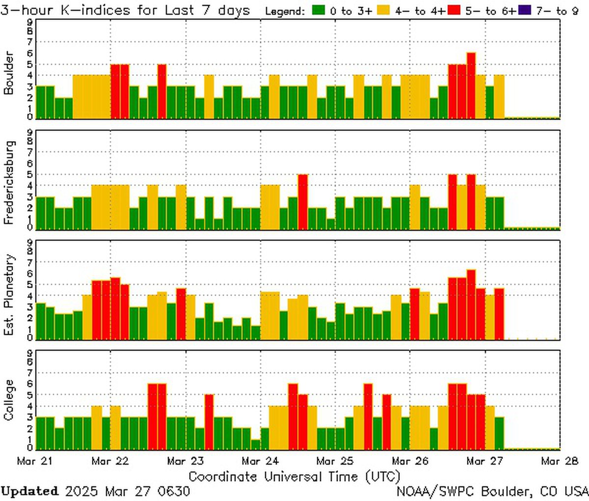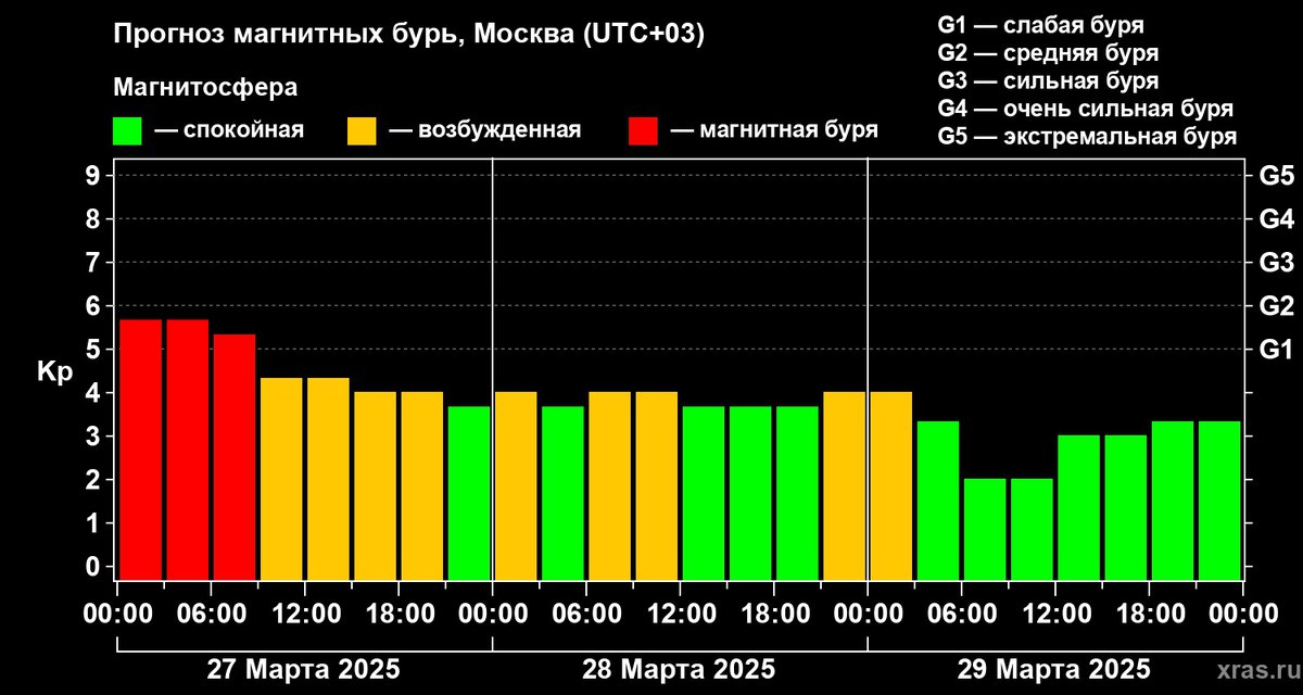 Возмущение магнитосферы Земли должно улечься к 28 марта, 29 марта станет совершенно спокойным днем. Судя по мониторингу NOAA, последним днем, относительно «чистым» от магнитных бурь, было 21 марта; с тех пор магнитосфера Земли регулярно возмущалась.