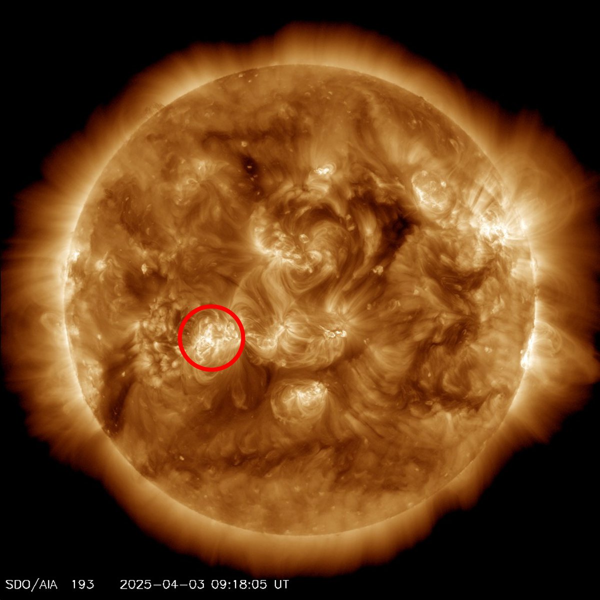 Сейчас пятно AR4048 — самое активное из всех, что обращены к Земле. На снимке, сделанном спутником Solar Dynamic Observatory, это пятно находится чуть левее и ниже центра — здесь можно заметить крупную светлую область.