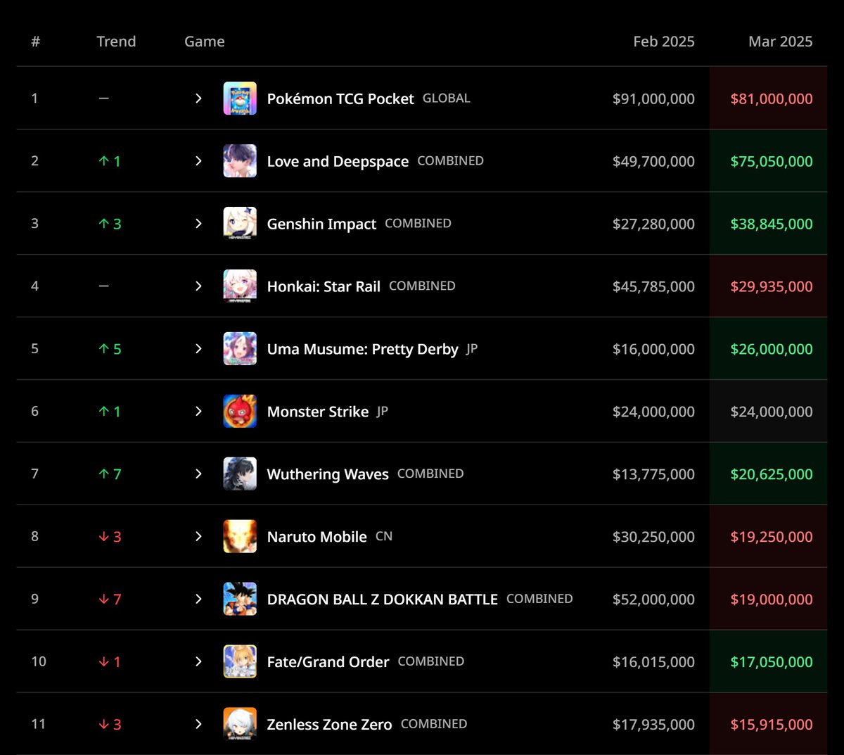 Примечательно, что некоторые конкуренты miHoYo смогли заметно улучшить прошлогодние показатели. Например, Love and Deepspace в марте 2025 года заработала $75 миллионов ($35.8 миллиона год назад), а Monster Strike показала выручку в $24 миллиона ($22 миллиона год назад).