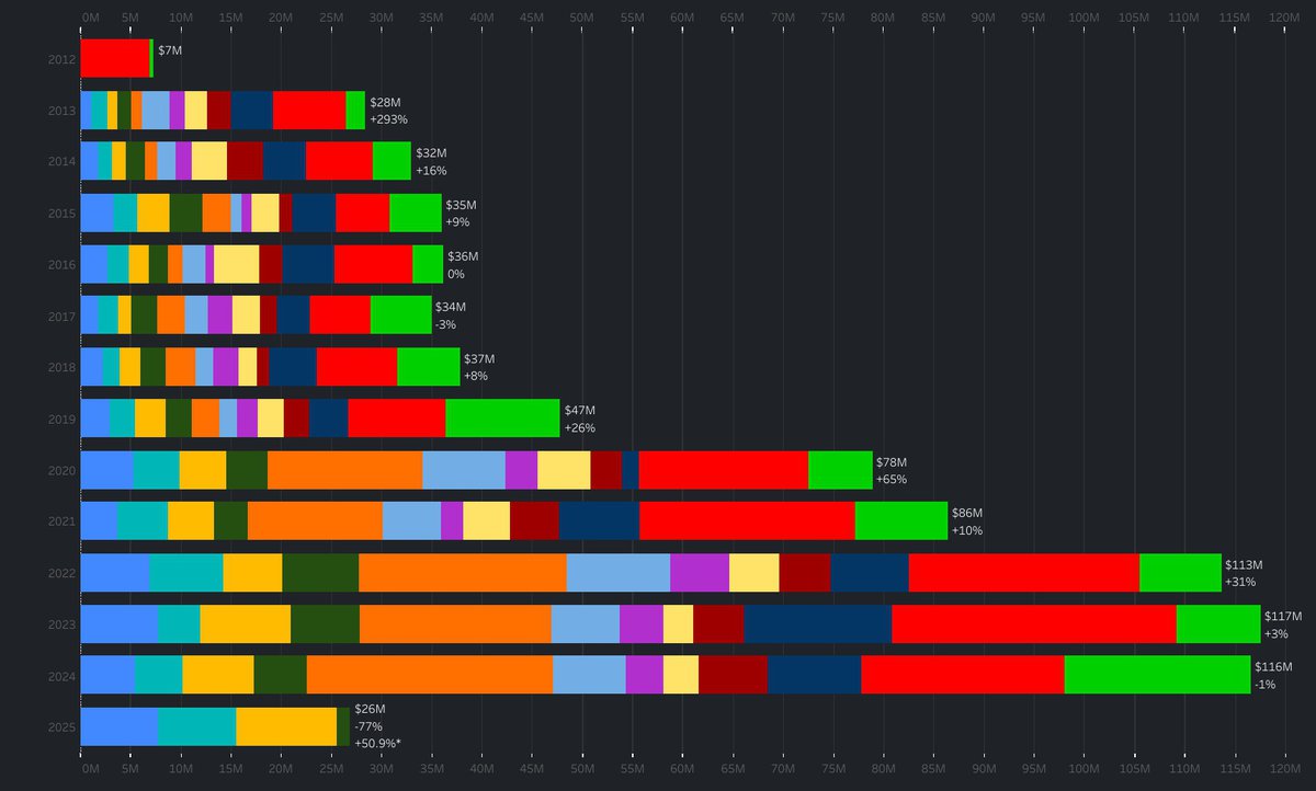 Согласно данным фанатского сайта, мониторящего выручку проекта, в начале 2025 года Star Citizen привлекает деньги активнее обычного. К началу апреля было заработано столько же денег, сколько в 2022-2024 годах удавалось получить к началу мая.