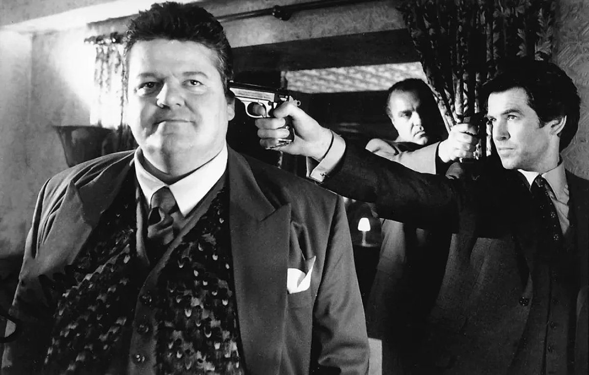 В сцене, рассказывает актёр, Робби Колтрейн заходил за занавеску, Броснан направлял на него пистолет, и Колтрейн говорил: «Только три человека в мире владеют этим оружием, и двоих из них я убил».