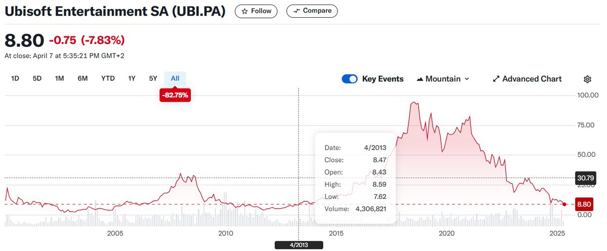 Стоимость акций Ubisoft продолжает падать: на странноватую сделку с Tencent наложились пошлины, введенные Дональдом Трампом. Начиная с 7 апреля компания лишилась еще 7.8% капитализации.