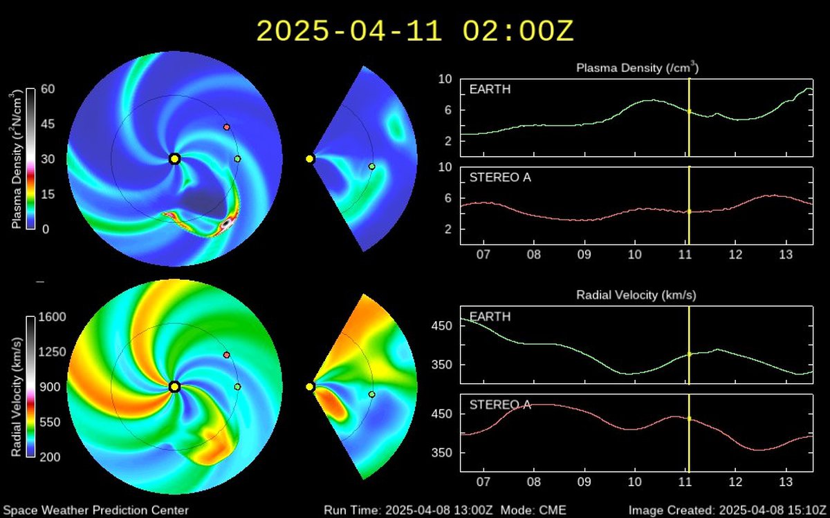 Согласно модели распространения солнечного ветра WSA-Enlil, если выброс и заденет Землю, то самым краем. В NOAA тоже считают, что в худшем случае сила геомагнитной бури 11-12 апреля окажется на уровне минимального класса G1.