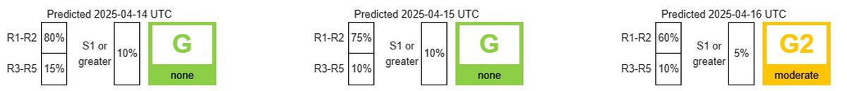 Начало магнитной бури ожидается во второй половине дня 16 апреля. По всей видимости, к геомагнитной буре приведет серия вспышек предмаксимального класса M, произошедшая на Солнце за последние сутки и сгенерировавшая корональные выбросы массы: через пару дней частицы солнечного ветра доберутся до Земли и возмутят магнитное поле планеты.