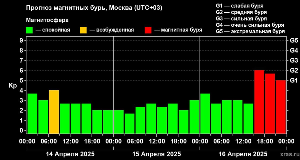 Предполагается, что геомагнитная буря 16 апреля начнется в районе 15:00 по Москве и сразу выйдет на максимально ожидаемый аналитиками класс G2. Ближе к ночи буря может немного утихнуть.