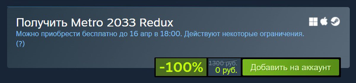 Забрать бесплатную копию Metro 2033 Redux могут все желающие, региональных ограничений нет. Нам удалось получить игру на российском аккаунте Steam без VPN, на казахстанском аккаунте тоже все в порядке.