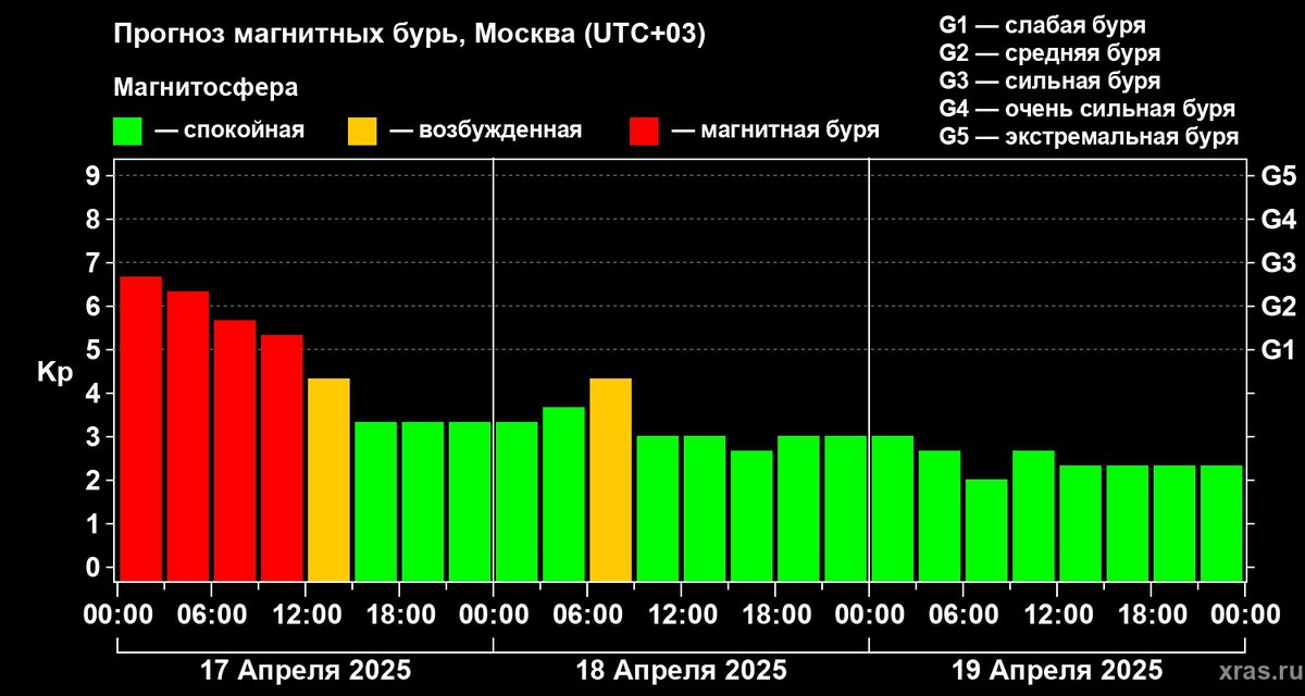 Ожидается, что после ночного пика буря все-таки пойдет на спад. Примерно до полудня 17 апреля по Москве сила бури будет на уровне класса G1-G2, затем Земля покинет поток плазмы и магнитосфера стабилизируется. В ближайшие дни других магнитных бурь не ожидается.