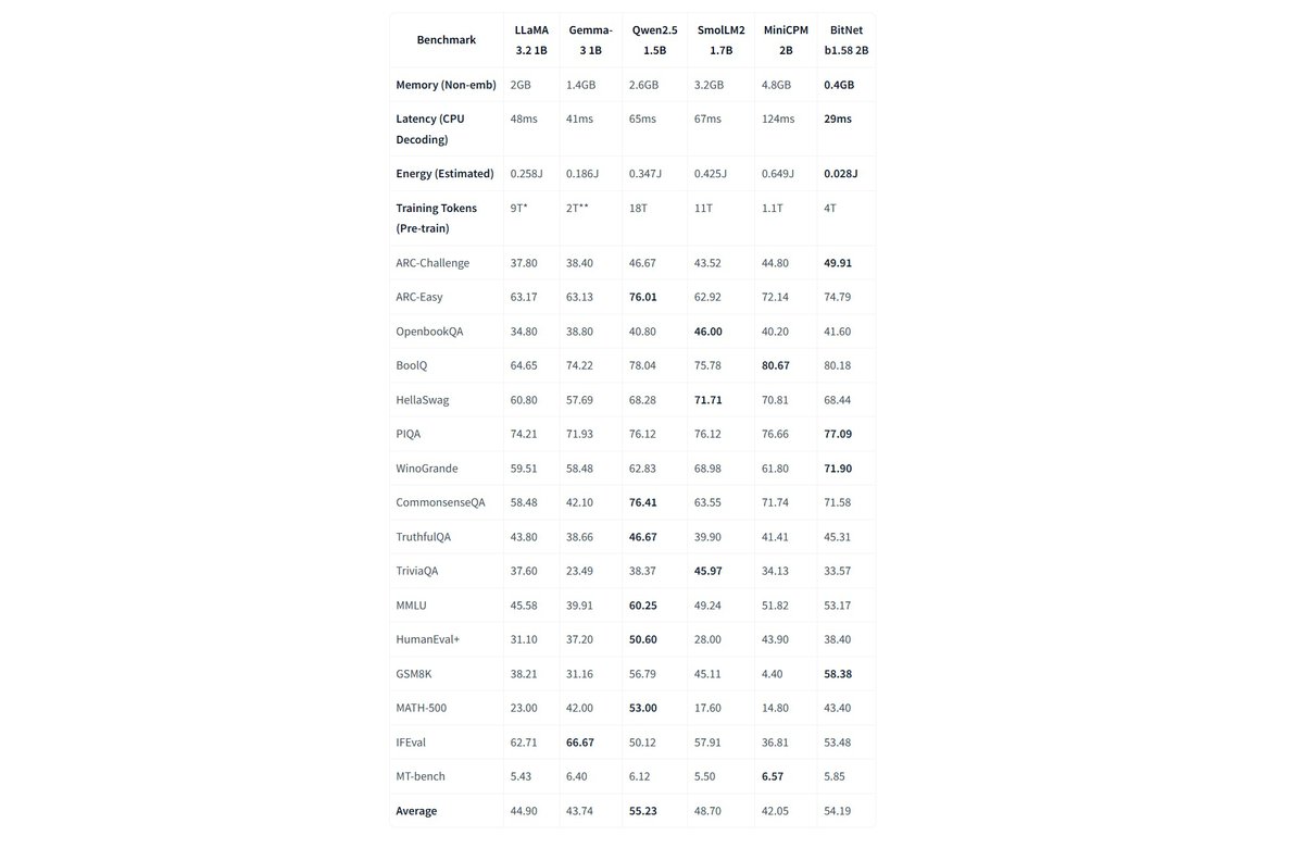 Для работы BitNet b1.58 2B нужно всего 400 мегабайт памяти (LLama 3.2 с 1 миллиардом параметров нужно 2 гигабайта), при этом модель работает быстрее протестированных конкурентов. Кроме того, BitNet b1.58 2B оказалась гораздо энергоэффективнее соперников.