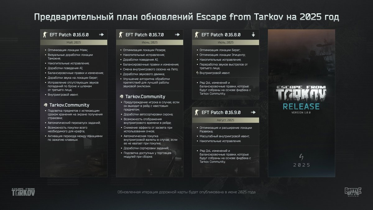Команда Battlestate Games опубликовала дорожную карту Escape from Tarkov до августа 2025 года. Разработчики планируют выпустить четыре крупных патча, от 0.16.6.0 до 0.16.9.0