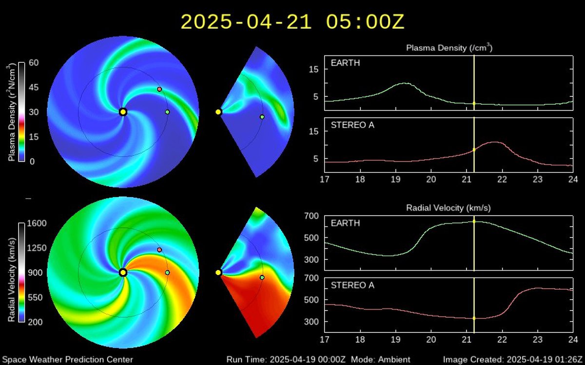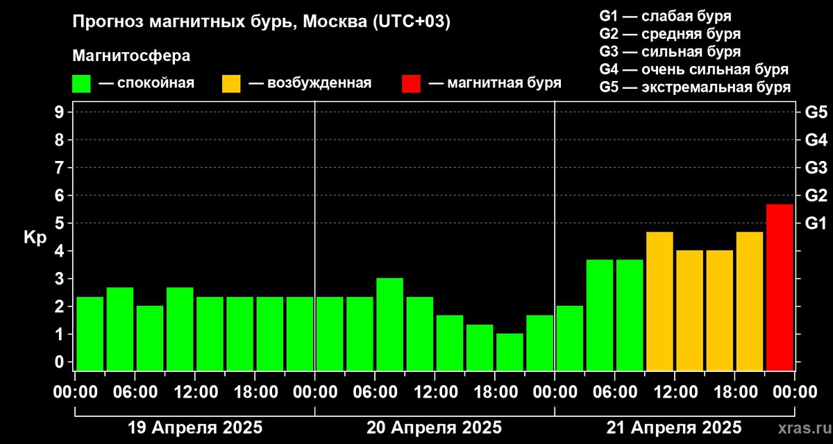 Ожидается, что Земля пересечется с потоком заряженных частиц 21 апреля. Сперва магнитосфера планеты начнет возмущаться, ближе к полуночи ожидается геомагнитная буря класса G2; позже она ослабнет до класса G1, а затем утихнет.