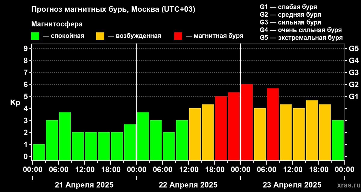 Затем магнитосфера Земли на некоторое время успокоится, после чего произойдет вторая магнитная буря, по силе близкая к классу G2. После этого, считают аналитики, до вечера 23 апреля Земля будет балансировать на грани геомагнитной бури класса G1.