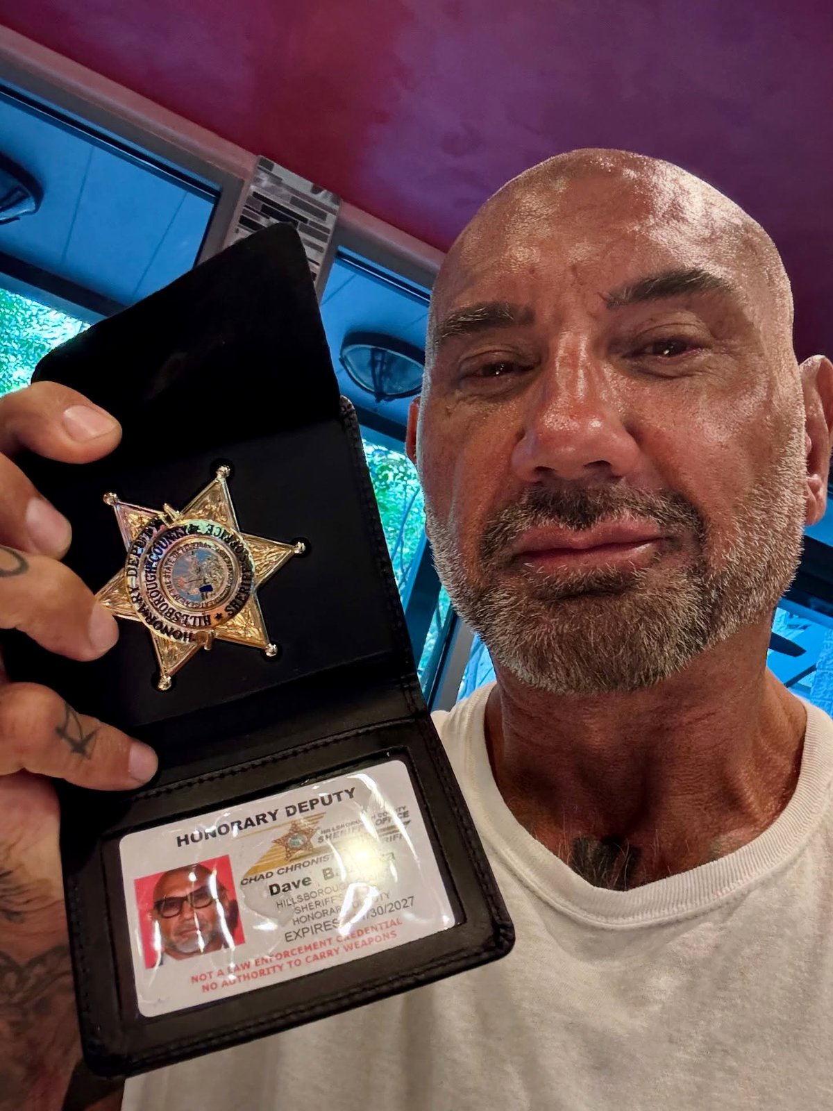 Актер и рестлер Дэйв Батиста получил звание почетного помощника шерифа округа Хиллсборо в штате Флорида. Фотографию удостоверения и звездочки Батиста опубликовал в своих социальных сетях.
