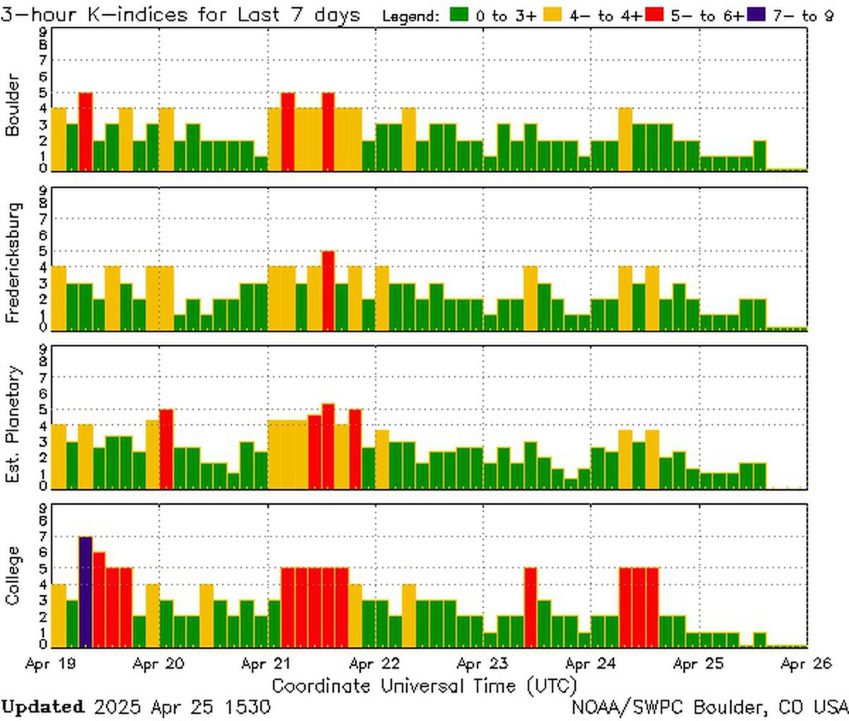 Судя по данным мониторинга NOAA США, 24 апреля фиксировалось легкое возмущение магнитосферы, но до глобальной магнитной бури дело действительно не дошло.
