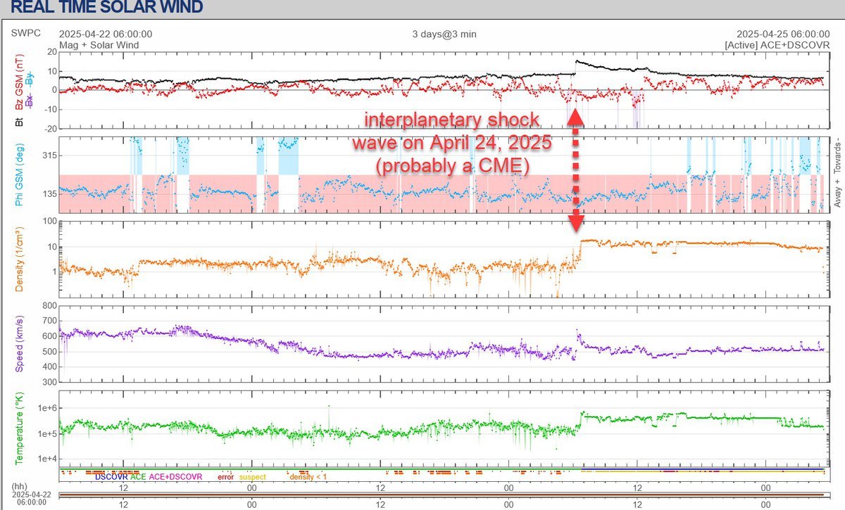 В первой половине дня 24 апреля мониторинговые службы зафиксировали попадание Земли в межпланетную ударную волну — фиксируемый детекторами поток солнечного ветра резко изменился и усилился. Пока не вполне ясно, что именно стало источником волны.