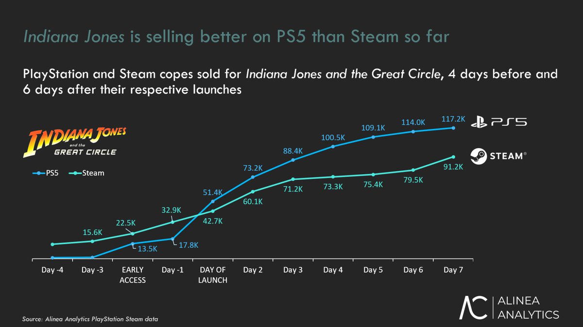 Версия приключенческого экшена Indiana Jones and the Great Circle для PlayStation 5 продается быстрее, чем Steam-версия игры, утверждает аналитическая компания Alinea Analytics. Продажи игры на двух платформах оценивались в первые 7 дней после выхода.