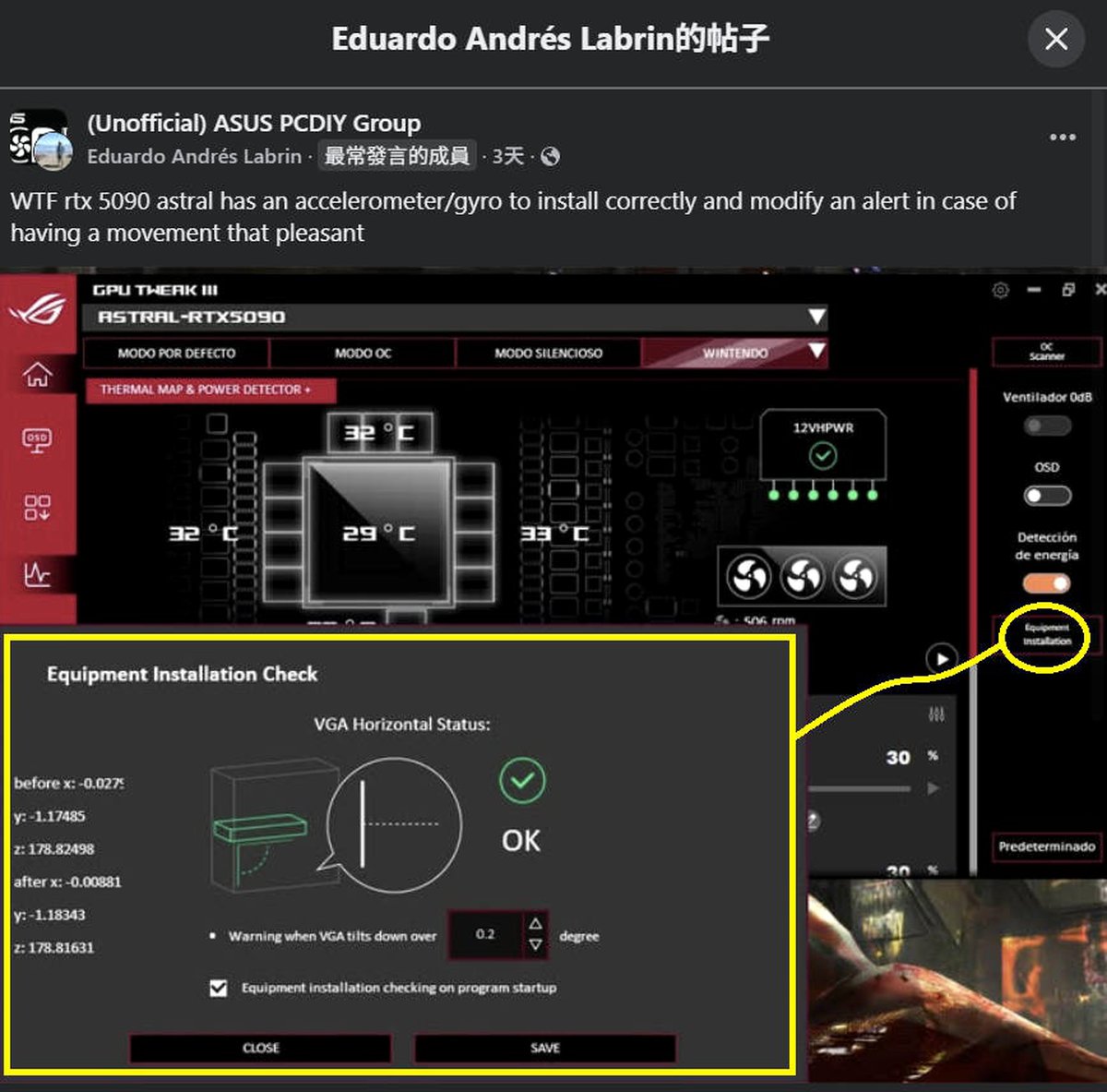 Компания ASUS снабдила видеокарты линейки GeForce RTX 50 ROG Astra акселерометром и гироскопом. Данные от этих устройств используются для определения провисания видеокарты.