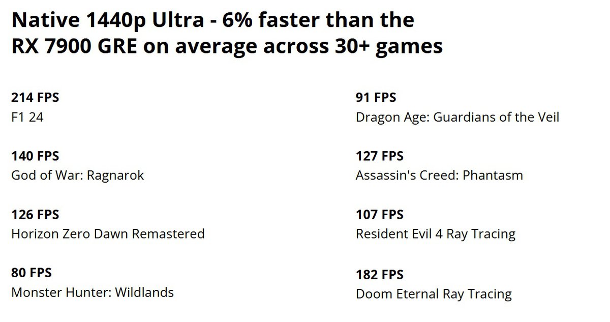 По оценке самой AMD, Radeon RX 9070 GRE примерно на 6% быстрее Radeon RX 7900 GRE; результат может варьироваться в зависимости от игры. Независимые тесты видеокарты пока не публиковались.