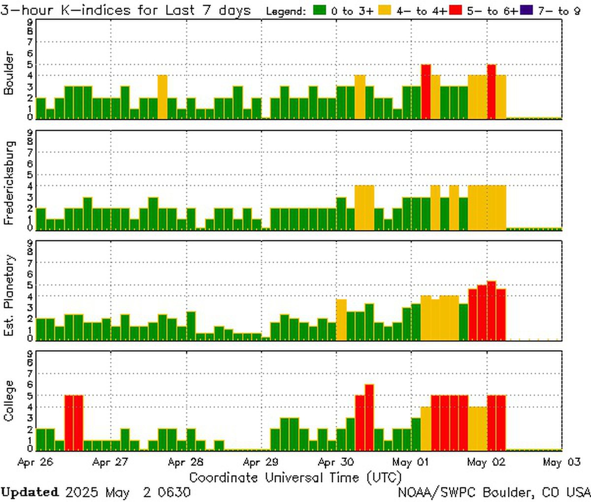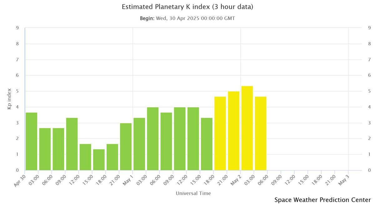 Согласно данным NOAA США, магнитная буря фиксируется в нескольких регионах планеты. Где-то она началась еще вечером 1 мая, в других областях геомагнитная буря была зафиксирована лишь утром 2 мая.