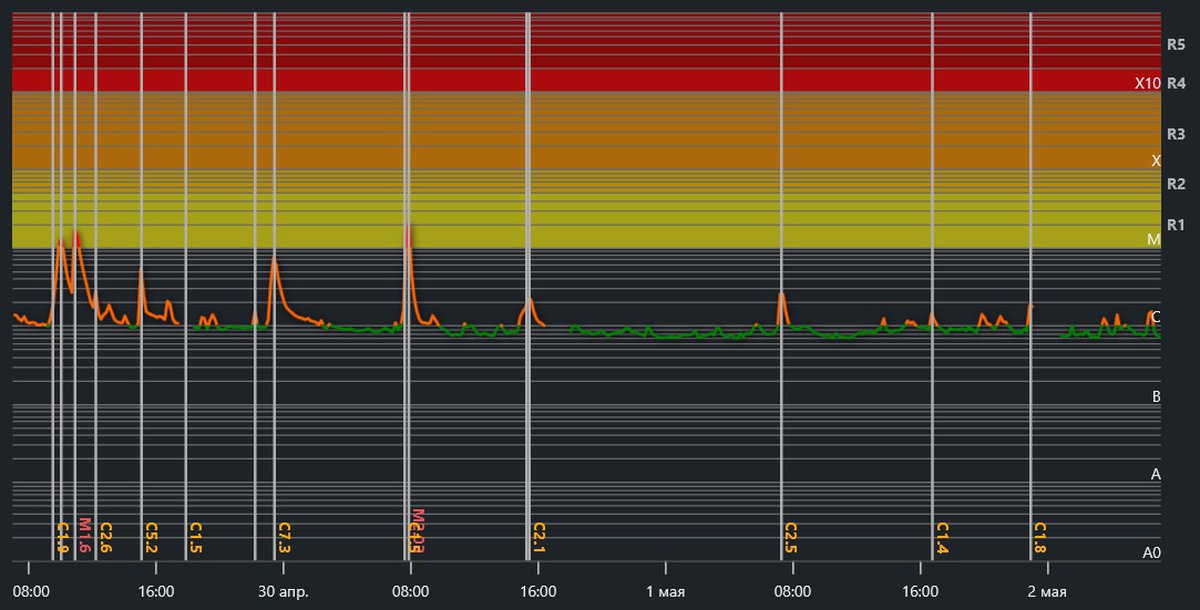 Не вполне ясно, что именно стало причиной магнитной бури 1-2 мая. В последние дни на Солнце не было мощных вспышек максимального класса X, но наблюдалось небольшое количество слабых вспышек предмаксимального класса M.