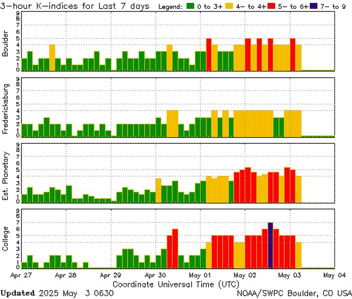 Внезапная геомагнитная буря, начавшаяся 2 мая, не спешит заканчиваться. Согласно данным NOAA США, буря оказалась продолжительнее первоначальных прогнозов — она идет до сих пор.