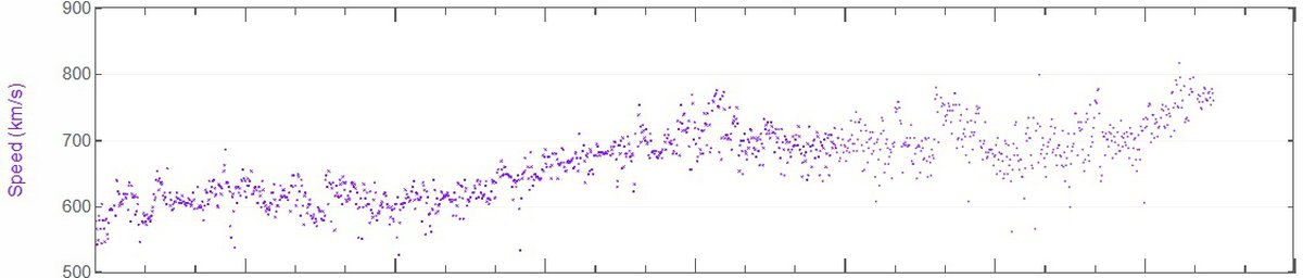 Скорость солнечного ветра сейчас превышает 770 километров в секунду, обычно этот показатель ниже 500 километров в секунду. Именно солнечный ветер и его заряженные частицы «надувают» магнитные бури — мощных вспышек на Солнце с корональными выбросами массы сейчас нет.