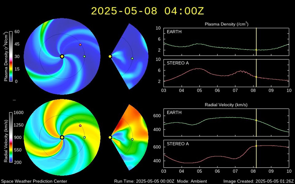 Согласно модели распространения солнечного ветра WSA-Enlil, Земля может находиться в потоке заряженных частиц вплоть до 8 мая. Есть вероятность, что магнитные бури закончатся раньше, но есть и шанс, что этого не произойдет — наша планета идет по самому краю потока.