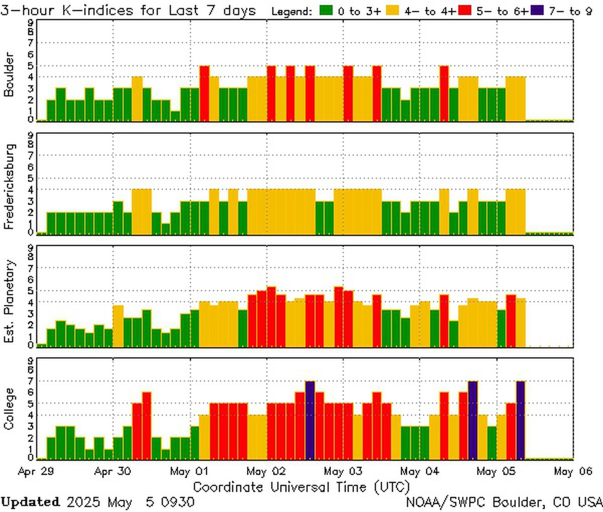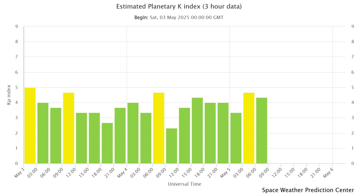 Согласно данным NOAA США, магнитосфера Земли остается возмущенной и 5 мая. Общепланетарный индекс магнитных бурь говорит об активности на уровне геомагнитной бури класса G1, но тут все сильно зависит от региона.