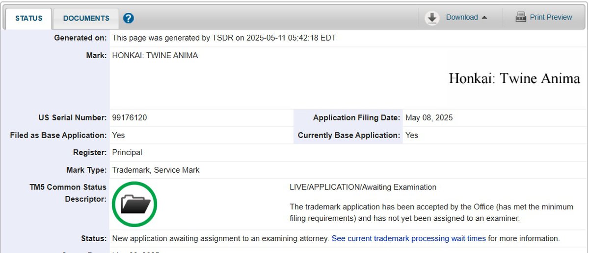 Заявка подана 8 мая по классам, включающим как видеоигры, так и другие категории — это делается для выпуска мерчендайза. Из-за сходства названия с Honkai Nexus Anima можно предположить, что речь идет именно о переименовании, а не о новом проекте.