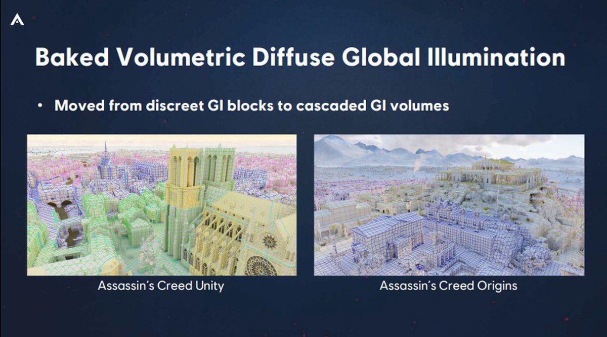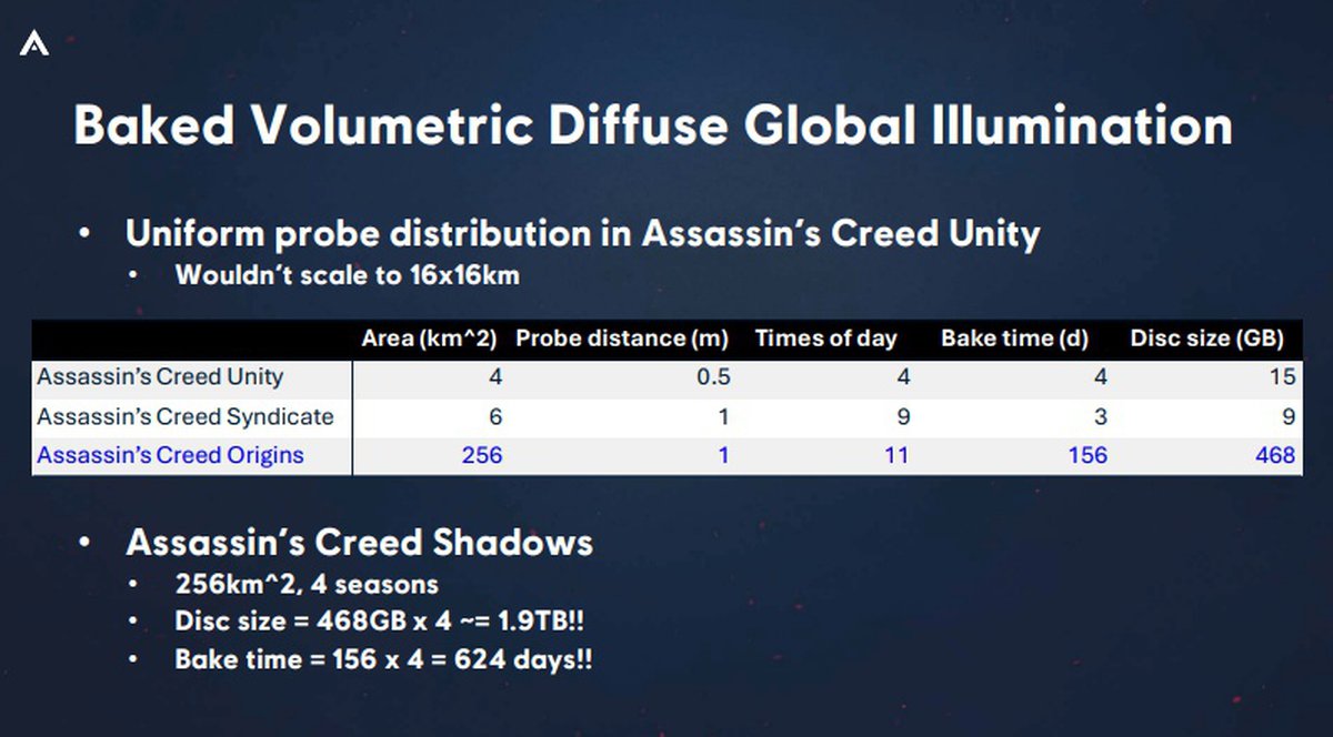 Примерно такой же подход применялся и во всех последующих частях Assassin's Creed. Например, в Shadows полностью просчитанное глобальное освещение потребовало бы нескольких терабайт данных, но в итоге разработчики ограничились 9 гигабайтами данных.