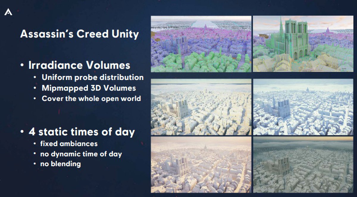 Оказалось, в Assassin's Creed Unity использовалось предварительно рассчитанное глобальное освещение для всего мира. Консолям и компьютерам игроков оставалось использовать имеющиеся данные — и хорошее освещение отрисовывалось без большой вычислительной нагрузки.