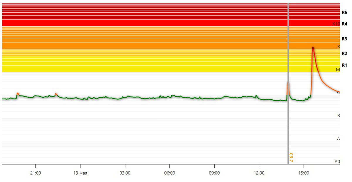 13 мая Солнце выдало вспышку максимального класса X — ее сила оценена на уровне X1.2. Это первая вспышка класса X за полтора месяца, в последний раз такая вспышка наблюдалась еще в конце марта.