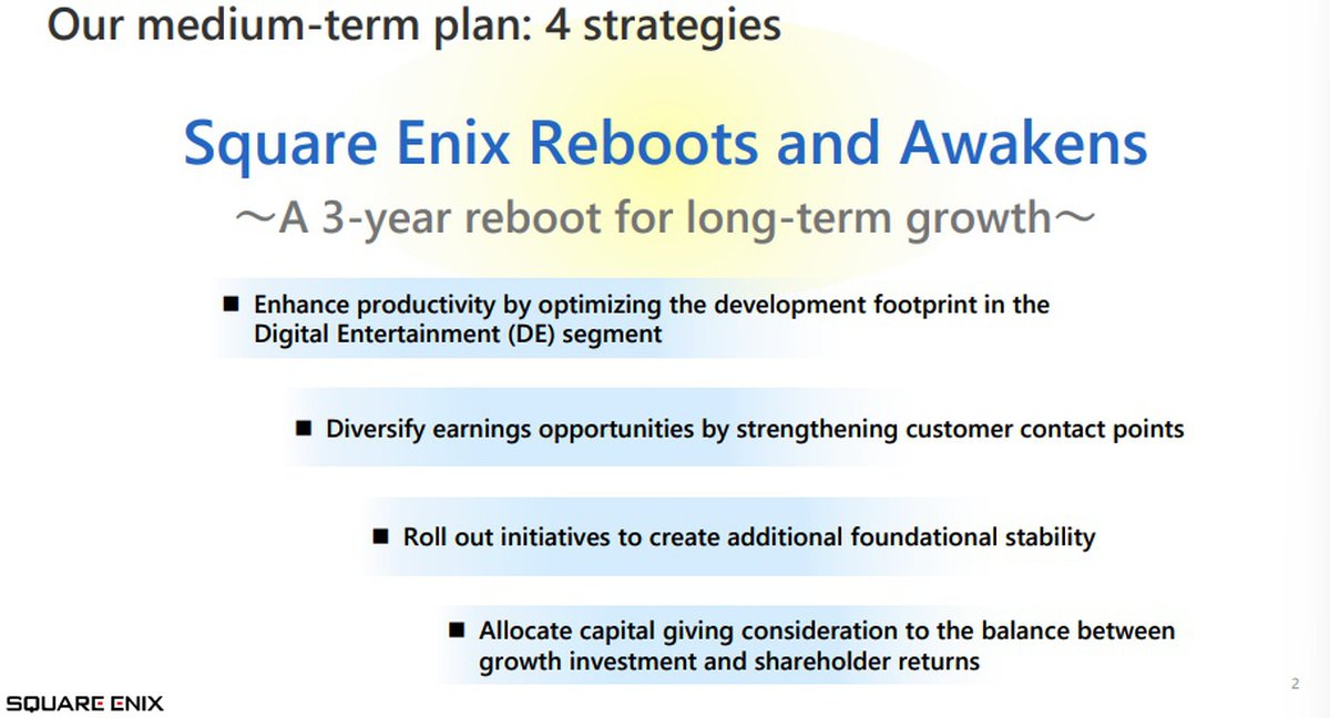 Саму стратегию в Square Enix называют «перезапуском и пробуждением» компании. Ожидается, что выполнение этой стратегии обеспечит компании рост в долгосрочной перспективе.