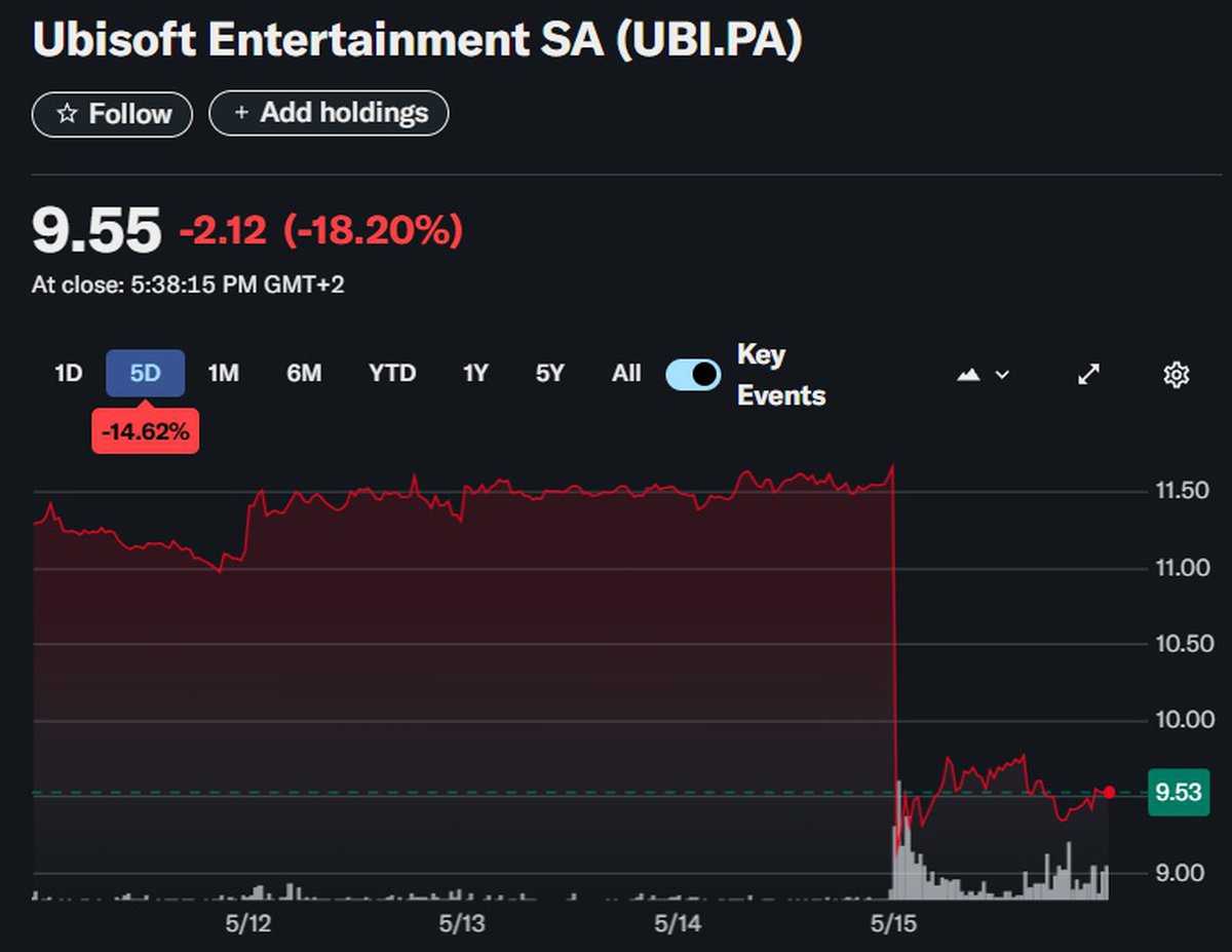 Акционерам не очень понравился последний отчет Ubisoft. После его публикации стоимость акций компании резко упала; вечером 15 мая снижение превышало 18%, в моменте Ubisoft дешевела на 20%.