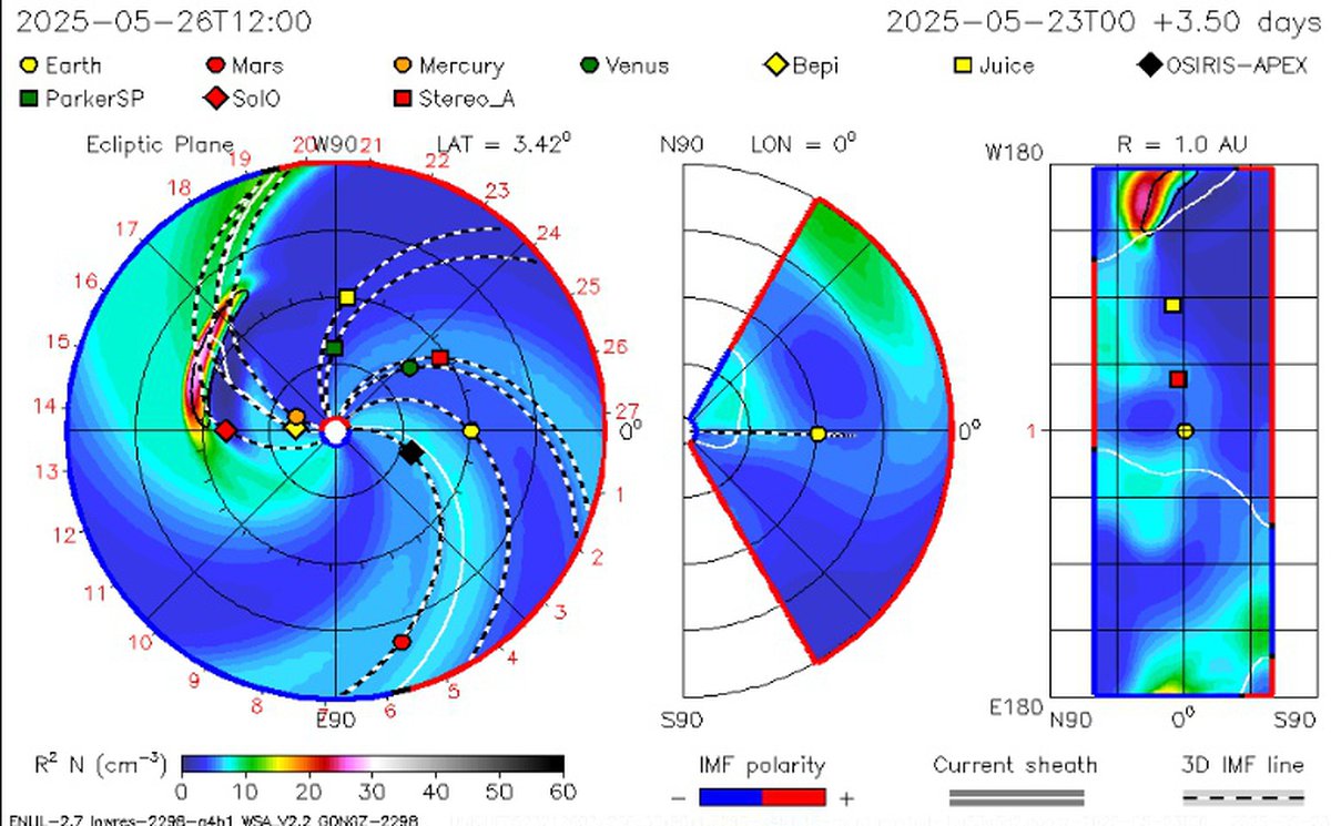 Вопреки прогнозам, на выходных 24 и 25 мая на Земле все-таки не будет геомагнитной бури. Заряженные частицы, выброшенные большой корональной дырой в атмосфере Солнца, пока проходят мимо планеты.