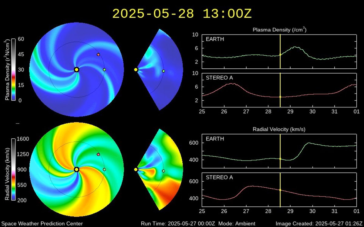 Примерно такой же прогноз геомагнитных бурь на 28 мая дают в NOAA. Правда, аналитики из США полагают, что буря будет соответствовать классу G1 на протяжении примерно шести часов, зато затем магнитосфера быстро успокоится.