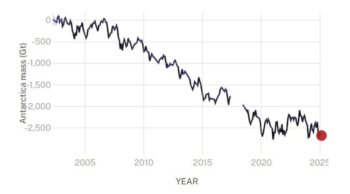 Согласно данным спутников NASA, следящих за ледяным покровом Антарктики, в 2002-2020 годах местный ледяной щит устойчиво терял массу, причем во второй половине периода этот процесс ускорился.