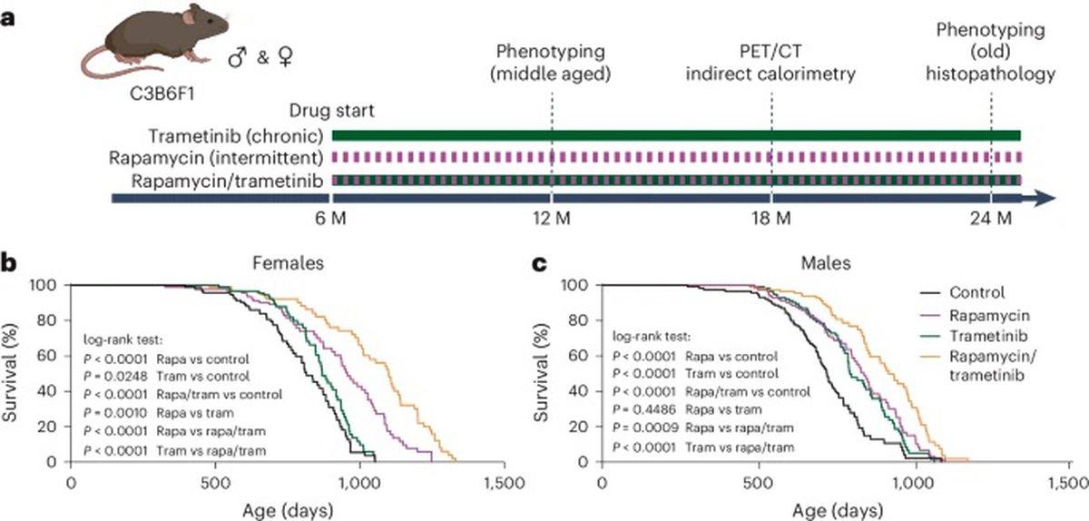 Из двух веществ рапамицин продлевал жизнь мышей примерно на 17-18%, а траметиниб повышал продолжительность жизни на 7-16%. Комбинация из двух веществ увеличивала продолжительность жизни на 26-35%.