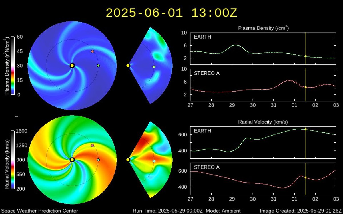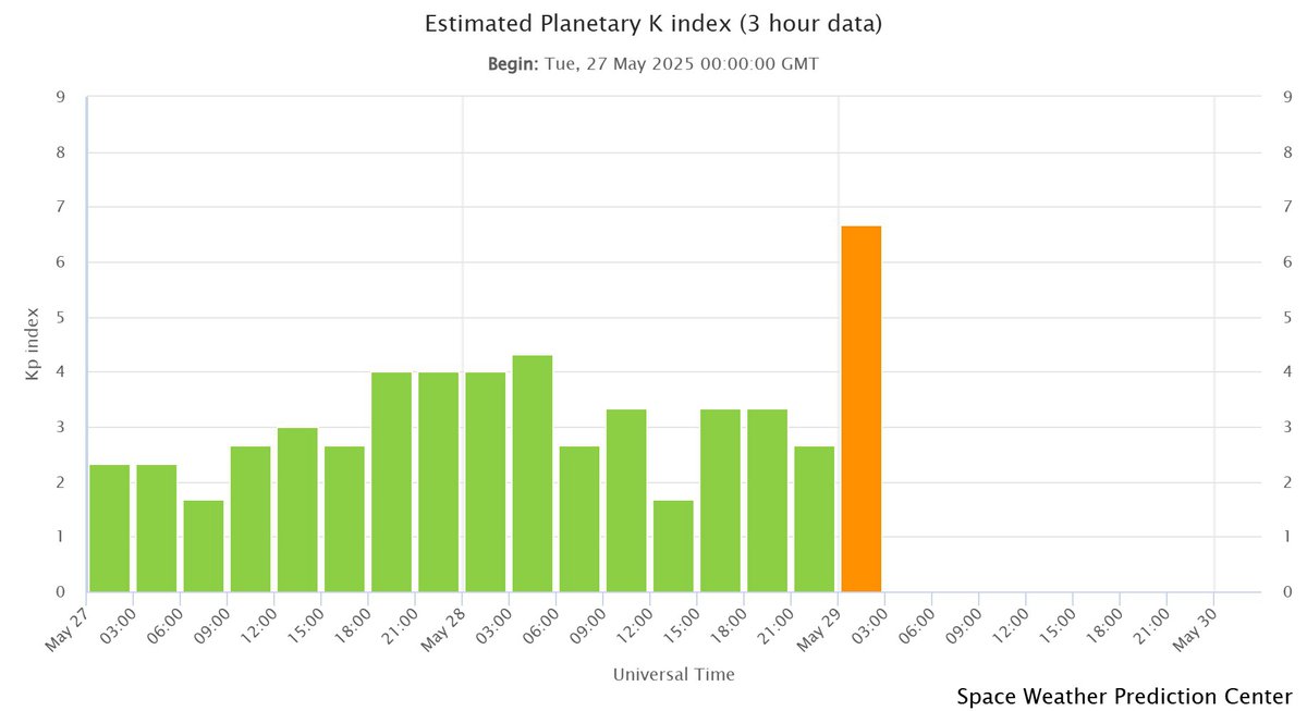 Согласно данным NOAA США, геомагнитная буря 29 мая оказалась глобальной и наблюдается в нескольких регионах планеты. Предполагается, что источником геомагнитной бури стал поток солнечного ветра из транс-экваториальной корональной дыры в атмосфере Солнца.