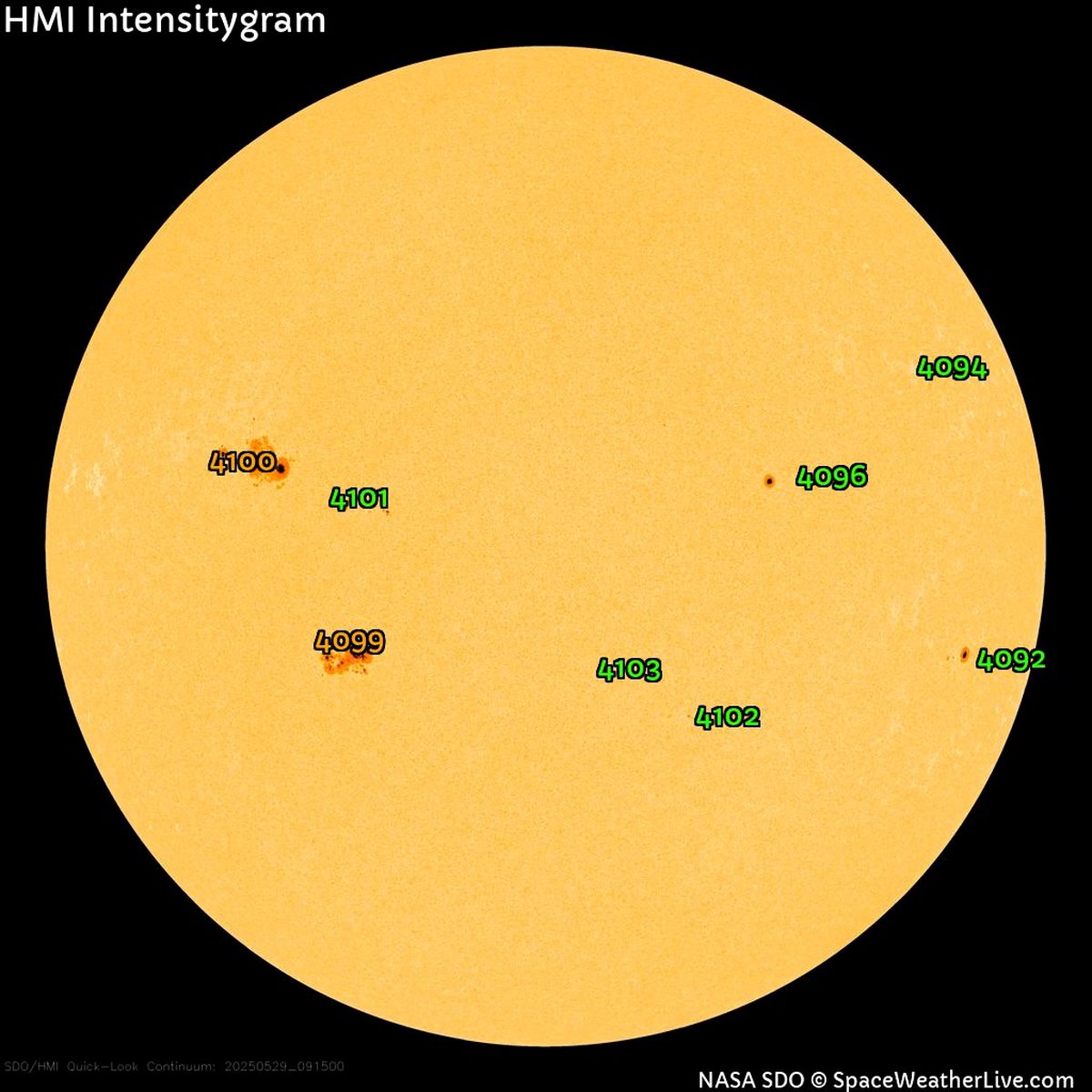 В последние пару дней на Солнце не происходило действительно мощных вспышек. На обращенной к Земле части звезды есть пара крупных и нестабильных пятен, но даже если они прямо сейчас произведут выбросы массы в сторону Земли, то магнитная буря начнется лишь в районе 1 июня.