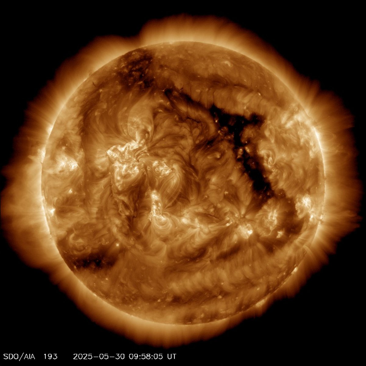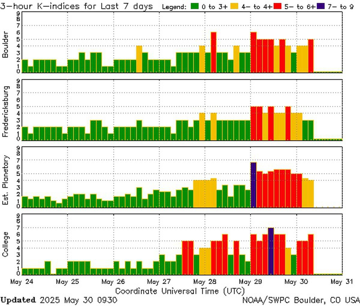 Геомагнитная буря, начавшаяся 29 мая из-за области совращающегося взаимодействия и корональной дыры на Солнце, никак не хочет утихать. Согласно актуальным прогнозам, буря растянется как минимум на первую половину дня 30 мая, но нет гарантии, что затем она кончится.