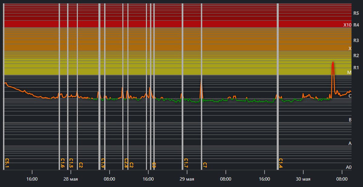 Такая возможность есть. В середине дня 30 мая на Солнце произошла вспышка класса M3.47, если она сопровождалась корональным выбросом, то быстрый поток солнечного ветра может принести заряженные частицы к Земле в самое ближайшее время.