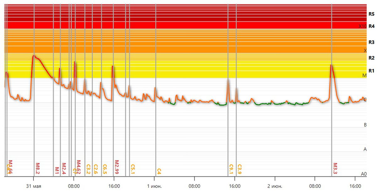 По продолжительности вспышки и интенсивности рентгеновского излучения можно предположить, что буря растянется на несколько часов и не превысит класс G2. Более точные прогнозы появятся ближе к вечеру 3 июня.