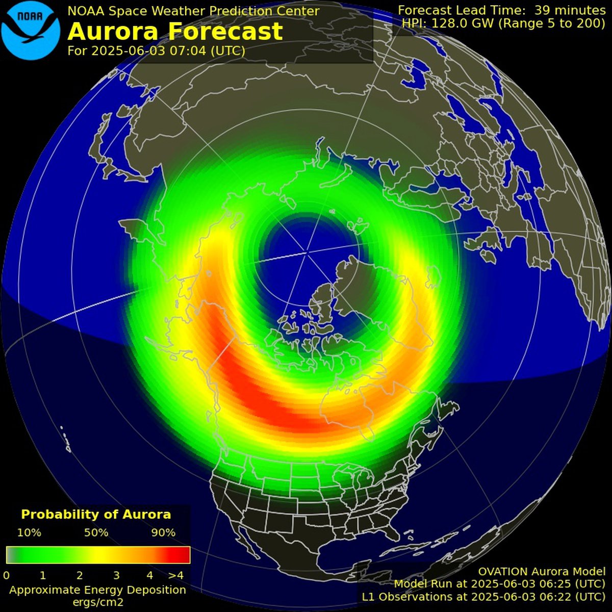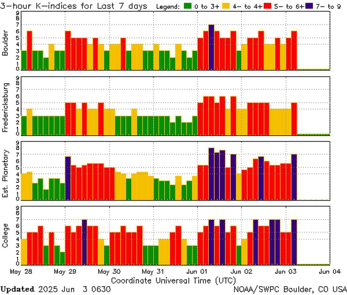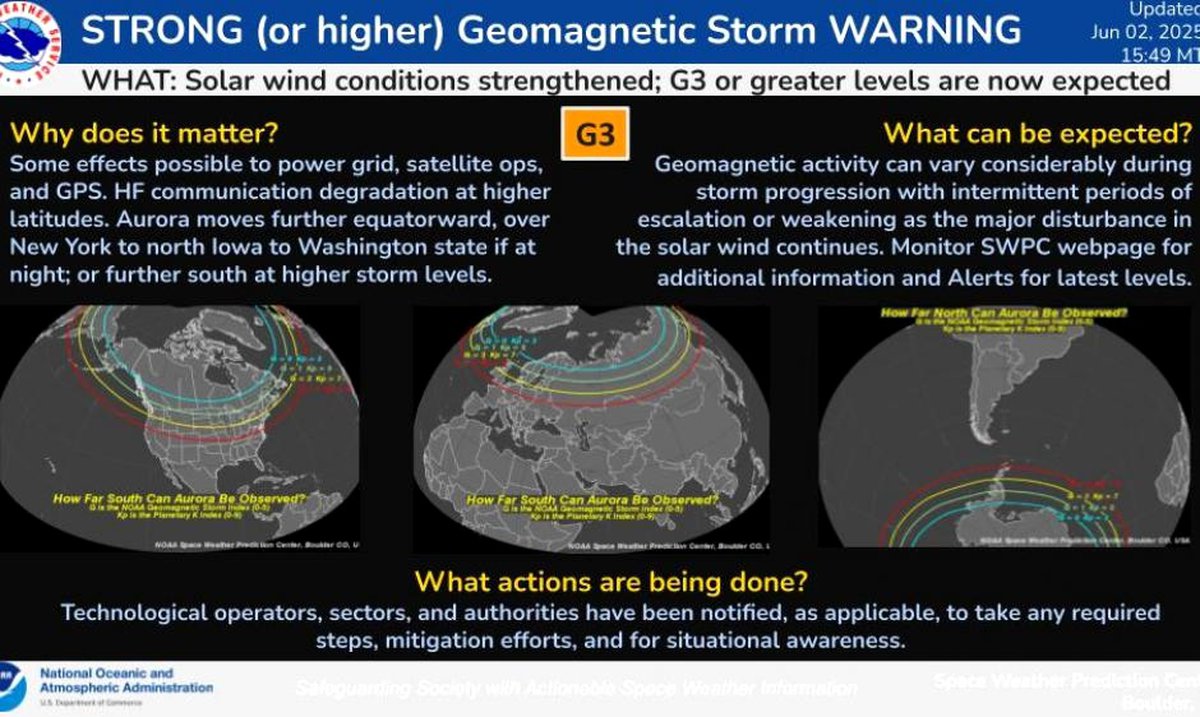 Вместо возбуждения магнитосферы на границе магнитной бури класса G1 утром 3 июня мы увидели полноценную магнитную бурю класса G3. В некоторых регионах, сообщает NOAA США, сила бури была немного ниже.
