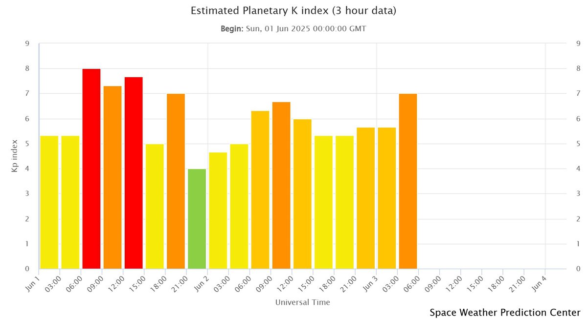 Мощная магнитная буря, начавшаяся 1 июня, все никак не закончится. Предполагалось, что 3 июня геомагнитная буря пойдет на спад и утихнет ближе к вечеру, но реальность превзошла ожидания аналитиков.