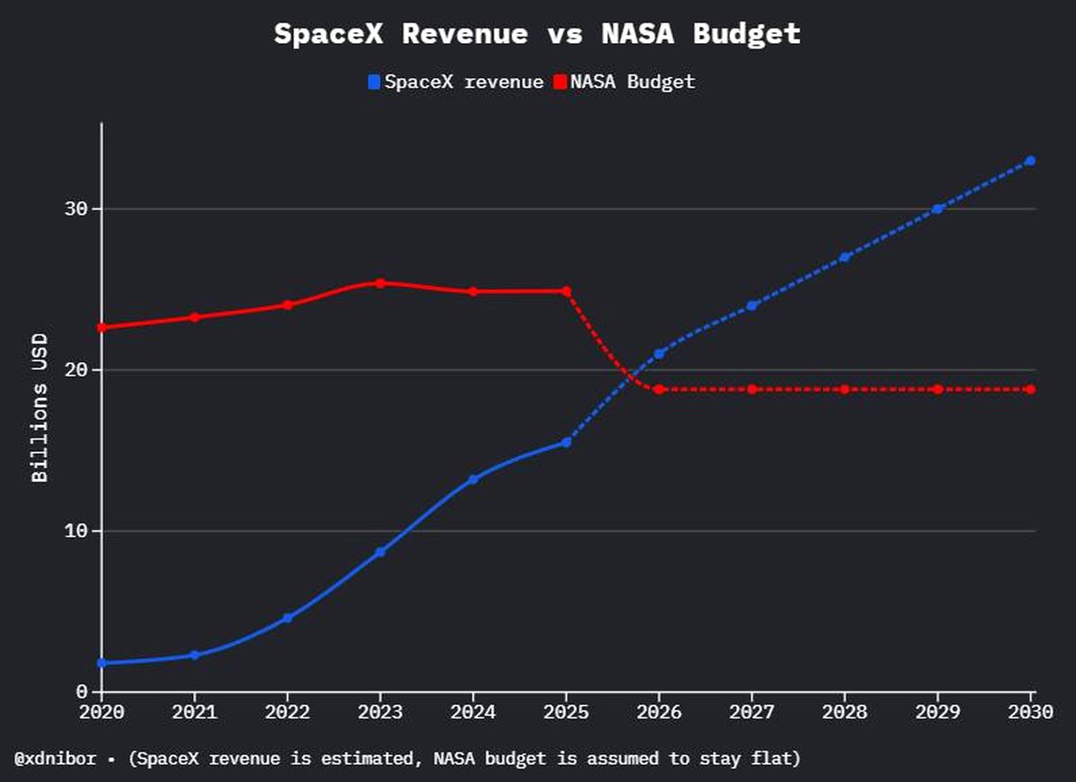 В 2026 году, считает основатель SpaceX Илон Маск, оборот его компании превысит бюджет NASA. Это может произойти, если власти США примут решение существенно урезать бюджет агентства.